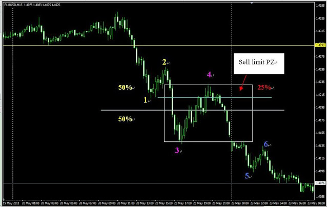 第三種作法就比較複雜一點,需要比較多的時間去思考,就是反彈出現小箱型整理區間有高低參考點(例如1與2或3與4)又或者有其他支撐阻力參考價位,就可以用limit單預掛交易。計算方式:高低點箱型分成上半部與下半部,通常上半部區域都可視為可以進場的價位區(price zone;PZ ),如果想攫取更多的獲利點數就可在將上半部分成一半,以最上方的25%價位區當作是預掛價位。