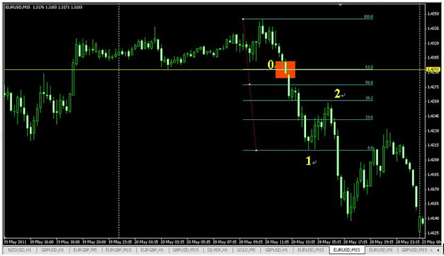 接著小反彈開始,通常對反彈的幅度大概都會習慣以婓波納奇回調線來衡量,此時就可以視情況尋找或等待適當的進場機會。---當然這時是否要進場,還是牽涉到趨勢的判斷。不過有些人藝高膽大的投資者會很大膽地主觀預期突破後的趨勢應該會繼續延續,因此此狀況下既然要加碼就還是維持同趨勢(下跌)的下單方向,然後在1-2的價位間找高點繼續作sell單。例如:
