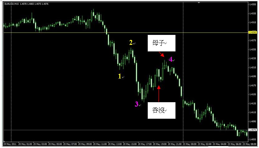 第二種作法就是當反彈整理時間拉長形成一個小箱型整理區間,可以尋找典型的K線燭台型態(就是吞沒、母子、晨/晚星)當作是進場訊號。