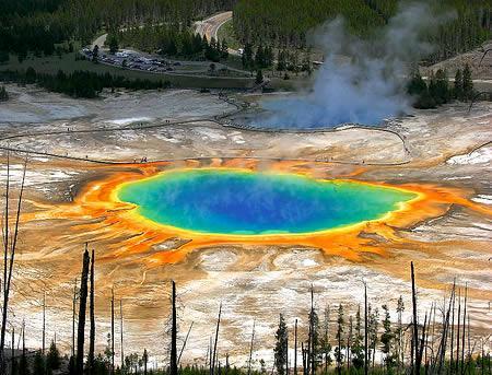 位于黄石国家公园的大稜镜温泉(The Grand Prismatic Spring,又称大虹彩温泉),是美国最大,世界第三大的温泉。它宽约75至91米,49米深,每分钟大约会涌出2000公升,温度为71°C左右的地下水。大稜镜温泉的美在于湖面的颜色随季节而改变,春季,湖面从绿色变为灿烂的橙红色,这是由于富含矿物质的水体中生活着的藻类和含色素的细菌等微生物,它们体内的叶绿素和类胡萝卜素的比例会随季节变换而改变,于是水体也就呈现出不同的色彩。