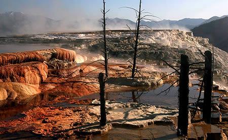 同样位于美国黄石公园猛犸温泉(Mammoth Hot Springs),是世界上已探明的最大的碳酸盐沉积温泉。它最显著的特点当属米涅瓦阶地,那是几千年来冷却沉淀的温泉水所形成的一连串阶地。每年有超过两吨的地下水流入马姆莫斯。