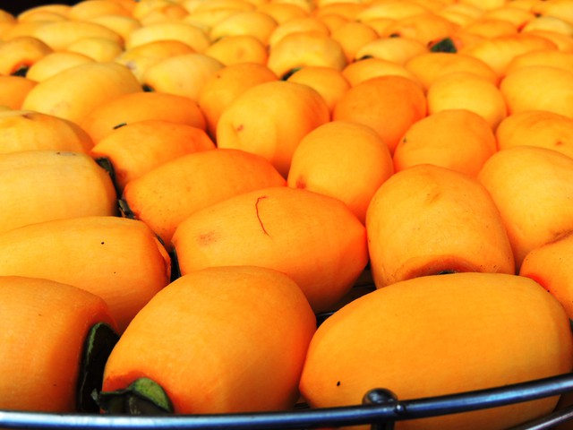 一般來說,柿子的採收期約在農曆九月,前後為期二個月,柿子採收後須先用持有的刨刀將外皮削去,削柿皮時刨刀不可重覆在一處上刨二次,而且刨的深度要一致,否則會造成柿青外皮破傷腐爛,否則就無法做出品質優良的柿餅了。