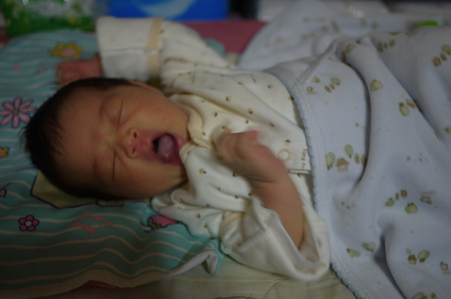 才寄望不哭餓的好現象可以維持下去,結果昨晚妹妹就從晚上10點給我盧到凌晨3點才睡,起初還是讓人摸不著頭緒,只知道她想吃奶,可是喝沒兩口就抽離,抽離一下又會因為沒喝到奶大哭…,搞了半天我火都旺了,因為她含著又抽離,這樣一來一往,搞得我(.)(.)超痛,加上她抽離後又對不準,我又要醒來將她拉過來嘟好,喝奶時間也因此拉長,側躺久了我的腰腿又開始犯疼…,而且看她一直該該叫不停,叫得我心都煩了,忍不住聯想她是不是在整我,我的母愛瞬間蕩然無存,要不是住在婆家,擔心吵到其他人,當時我還真想直接雙手一攤就任由她去哭…(ㄜ~我真是個殘忍的母親耶>”<~~不過想歸想,當然不可能真狠得下心啦~~)