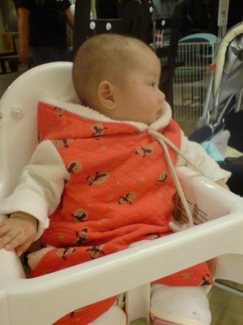 這天帶著沛到IKEA去試坐餐椅,首度幫她拍下第一張光頭照...(因為相機沒帶下車,只好用手機應急,拍起來有點迷朦...)