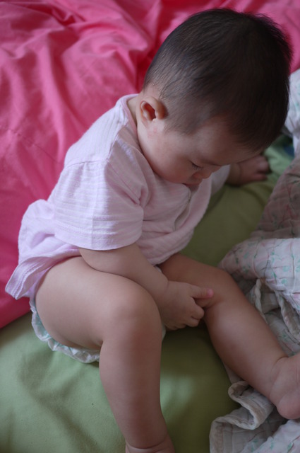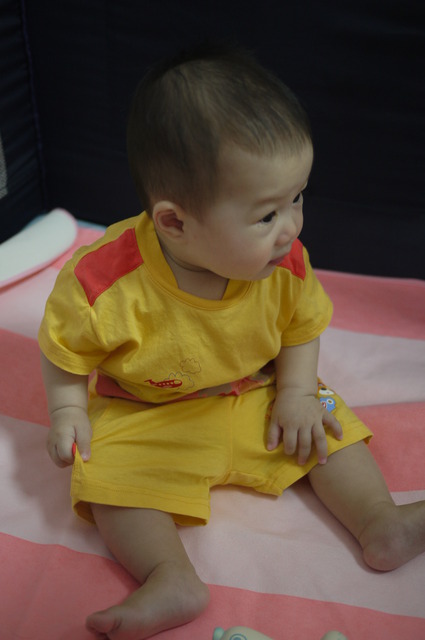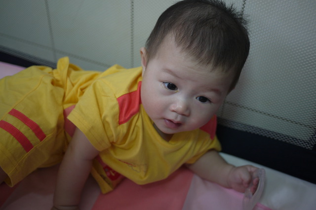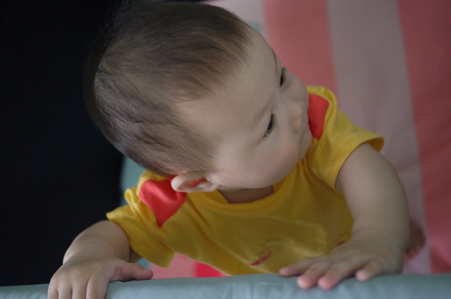 沛現在除了愛到處爬之外,也已經出現想學站的慾望,不但巴著床頭、遊戲床邊或任何鄰近物站起來...甚至就連在推車上她也不放過任何機會,就是要翻身攀爬站起來= =”,在遊戲床內也很愛單手扶著床邊,然後很囂張的放單手站立...甚至~還常常嘗試放兩手...常常故意讓自己奮力重重往後倒...小孩的"憨膽(台語)"真叫人佩服啊!!