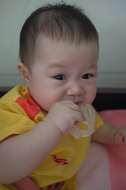 啃固齒器姿態也百百款,有時候親餵喝奶也來這招~