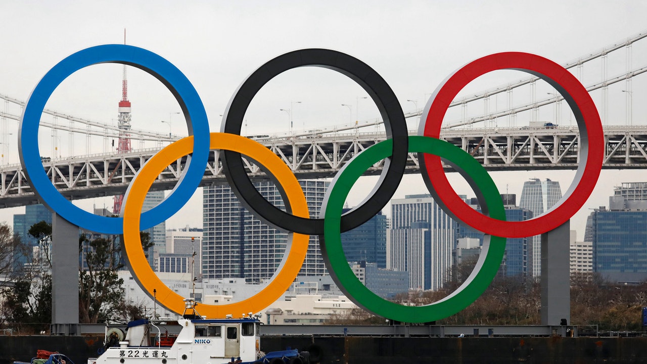 2020年3月18日,東京御台場海濱公園豎立奧運五環的標誌。(Getty Images)