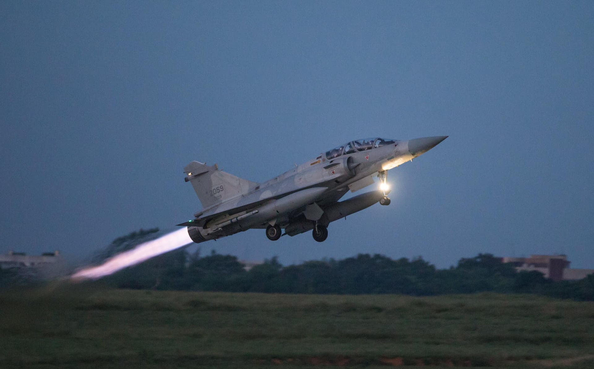 台空軍幻象2000-5Di雙座戰機在晨曦中緊急起飛,大開後燃器高速爬升。(台灣國防部提供)
