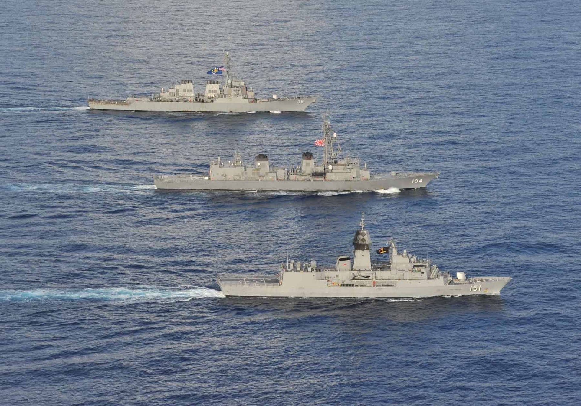 日本與澳洲、加拿大才剛剛在菲律賓海周邊,進行三國聯合海上演練,規模也相當罕見。(防衛省海上自衛隊)